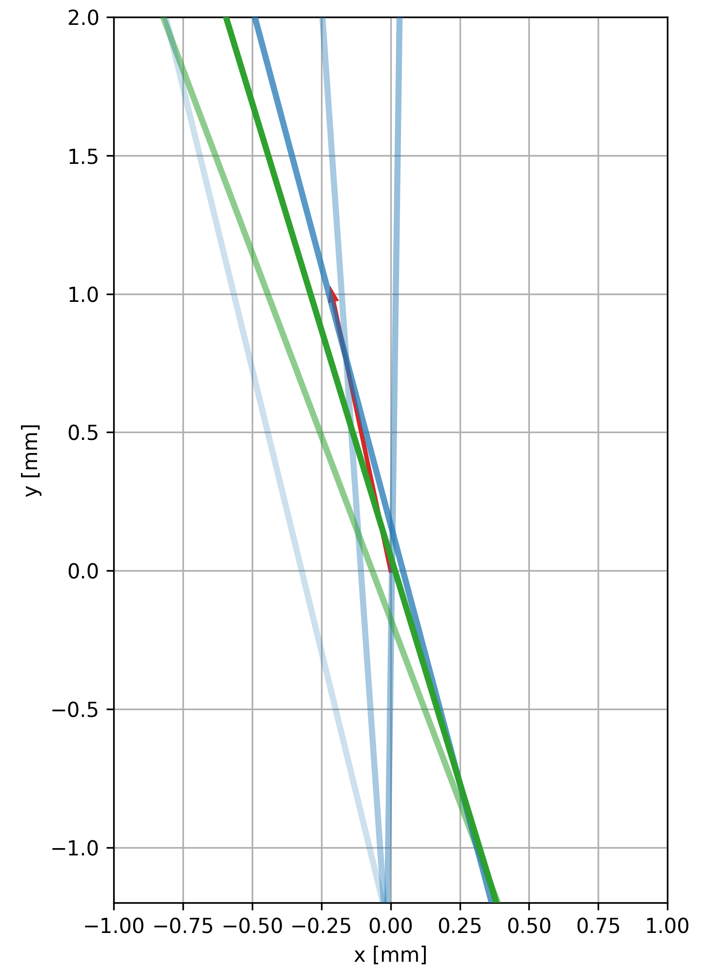 There is also a solid green line, i.e. a high-momentum negatively charge particle that doesn't quite meet at this point. Finally, there is a light blue line that also doesn't meet at the point, but does cross the solid green line around y=0.6 mm.